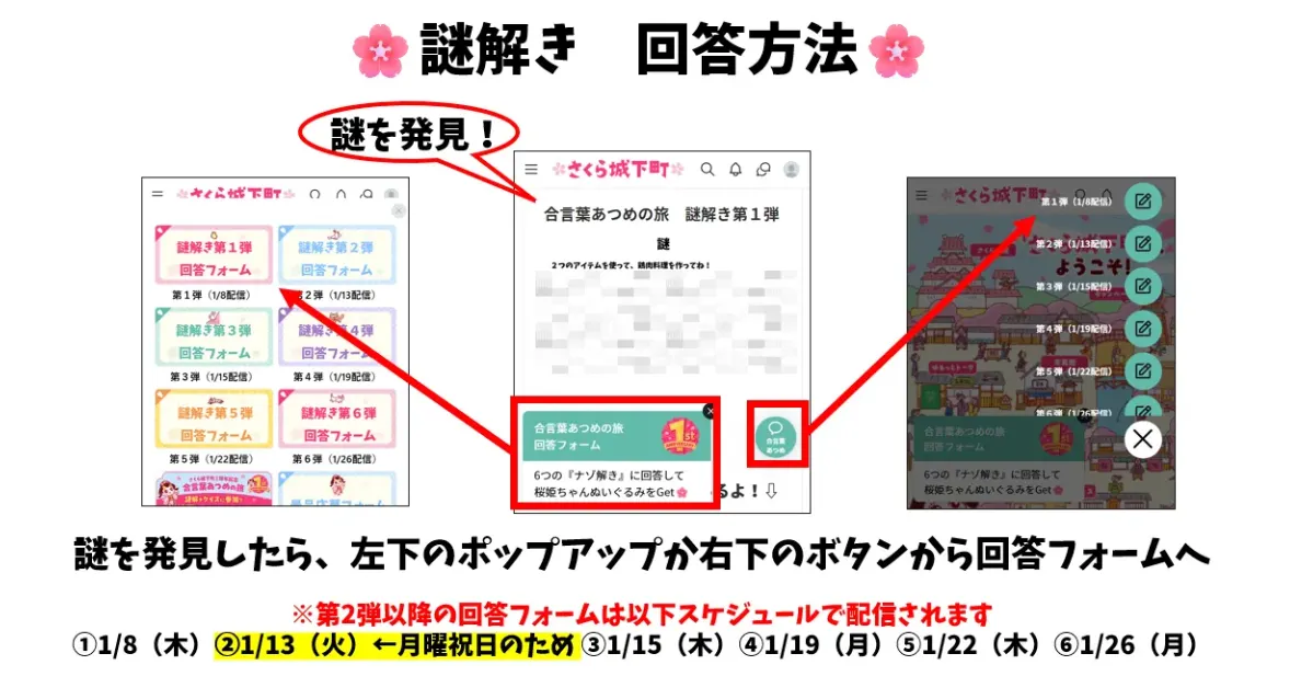トップ > 桜姫ニュース > 合言葉あつめの旅 謎解き第6弾 ぴんく桜姫ちゃん 運営メンバー 2026/01/26 10:01 合言葉あつめの旅 謎解き第6弾 ⇩この下にヒントがあるよ!⇩ いいね 共有する 共有する リンクをコピー コメントする 2 件の返信 (新着順) ミュートしたユーザーの投稿です。 投稿を表示 さいきん 1周年アワード受賞者 2026/01/28 09:27 謎解き第6弾にも挑戦して、応募しました。 ご縁があるとうれしいです。 いいね 返信する ミュートしたユーザーの投稿です。 投稿を表示 ぴよこ 1周年アワード受賞者 2026/01/26 23:10 応募できました😊 桜姫ちゃんのぬいぐるみ、届きますように…🌸 いいね 返信する