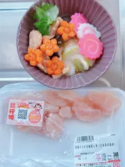 元旦のお雑煮【桜姫🌸ささみ】 年越しそばとお雑煮は、家族が毎年作るので、売り場を見ていなかった私🤭冷凍コーナー覗いてました👀 「ささみしかなかった〜😱」とのこと。多分もも肉スライスが欲しかった模様。 にんじんは私が切りました🥕毎年角餅、醤油と麺つゆの汁ですネギ、三つ葉、たもぎだけ、🍥