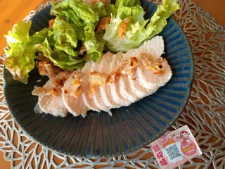先日作りました! 桜姫の鶏むね2枚購入したので、1つは定番サラダチキンに…鶏皮を使ってソースの一部にしています。(ソースがわかりにくいですが…)