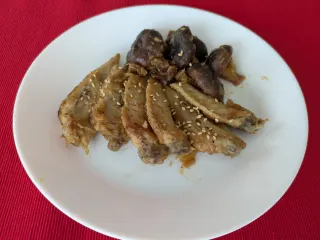 手羽先の先っぽでスープを取りました。その先っぽをしいたけと一緒に、甘辛い調味液で味付けました。 ビールのつまみに最高でした。