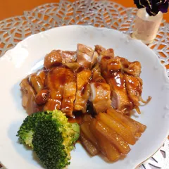 もも肉を醤油1/5カップ、みりん2/5カップで蓋をして 10分、ひっくり返して蓋を外して10分煮ました😋(1日ほした短冊きりの大根も一緒に煮ました)煮汁は煮詰めてソースにしました💓
